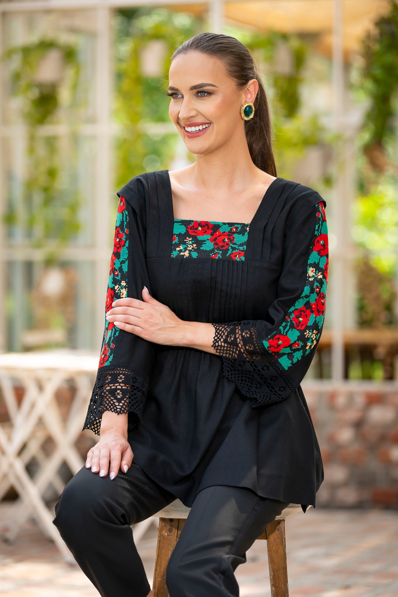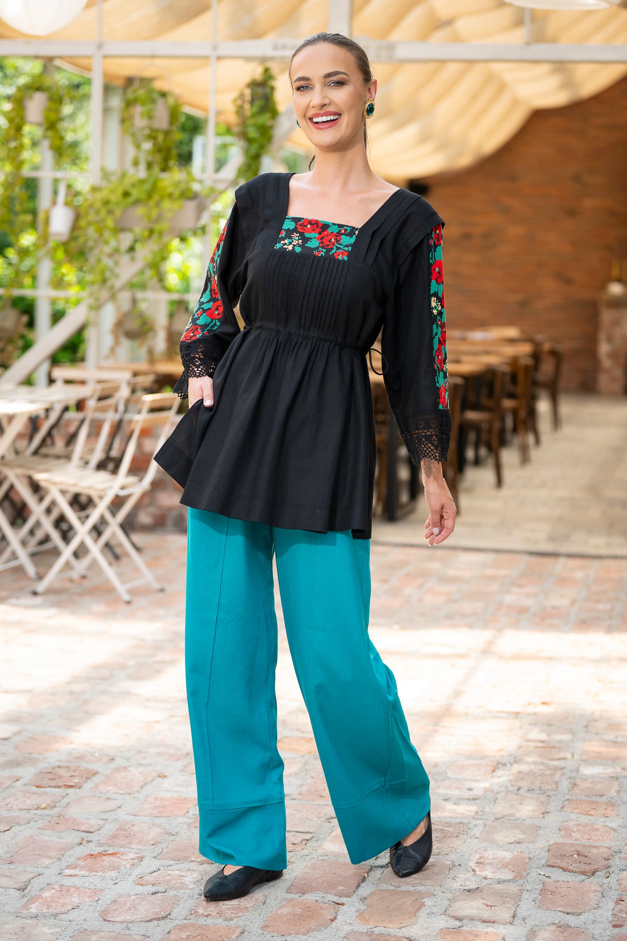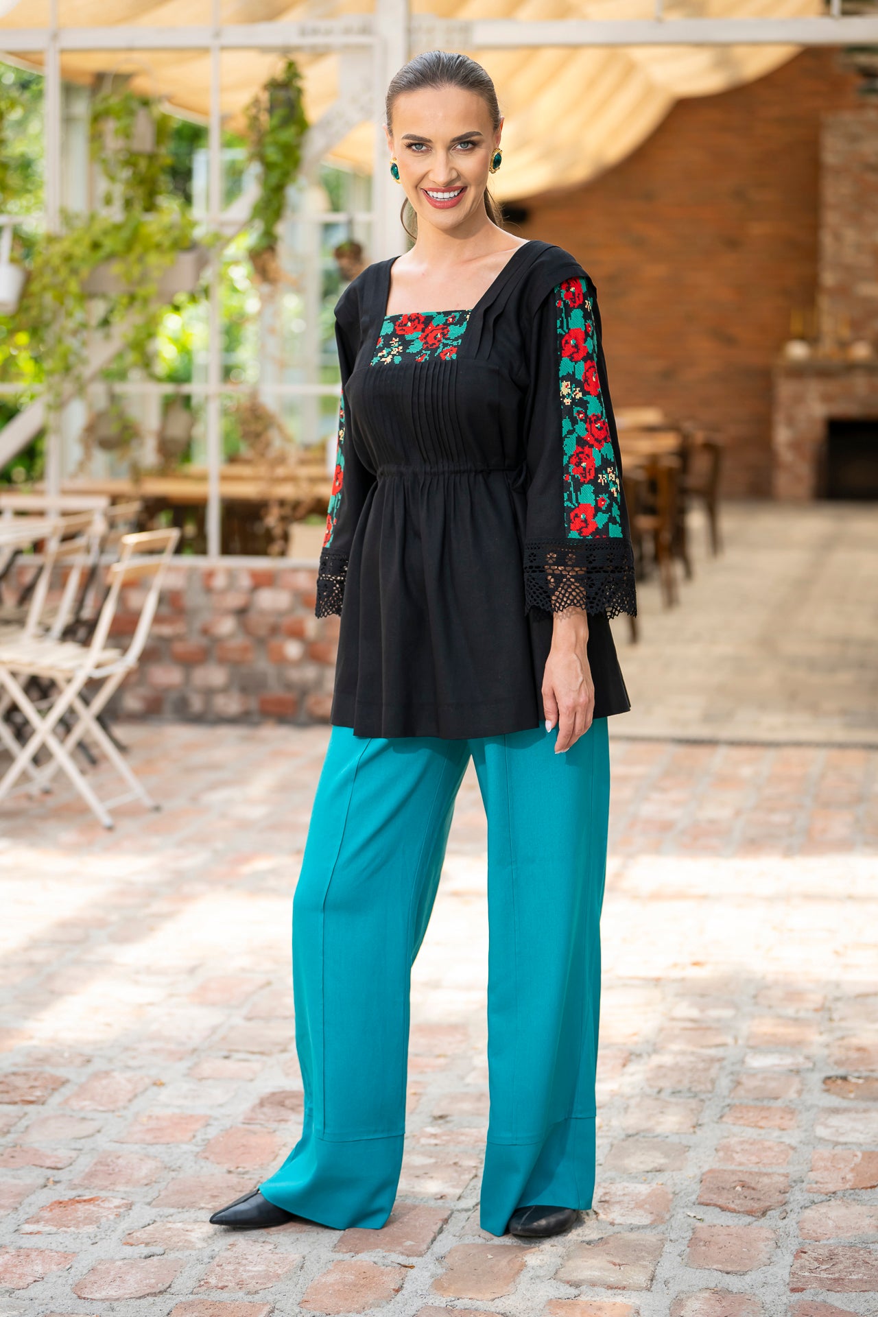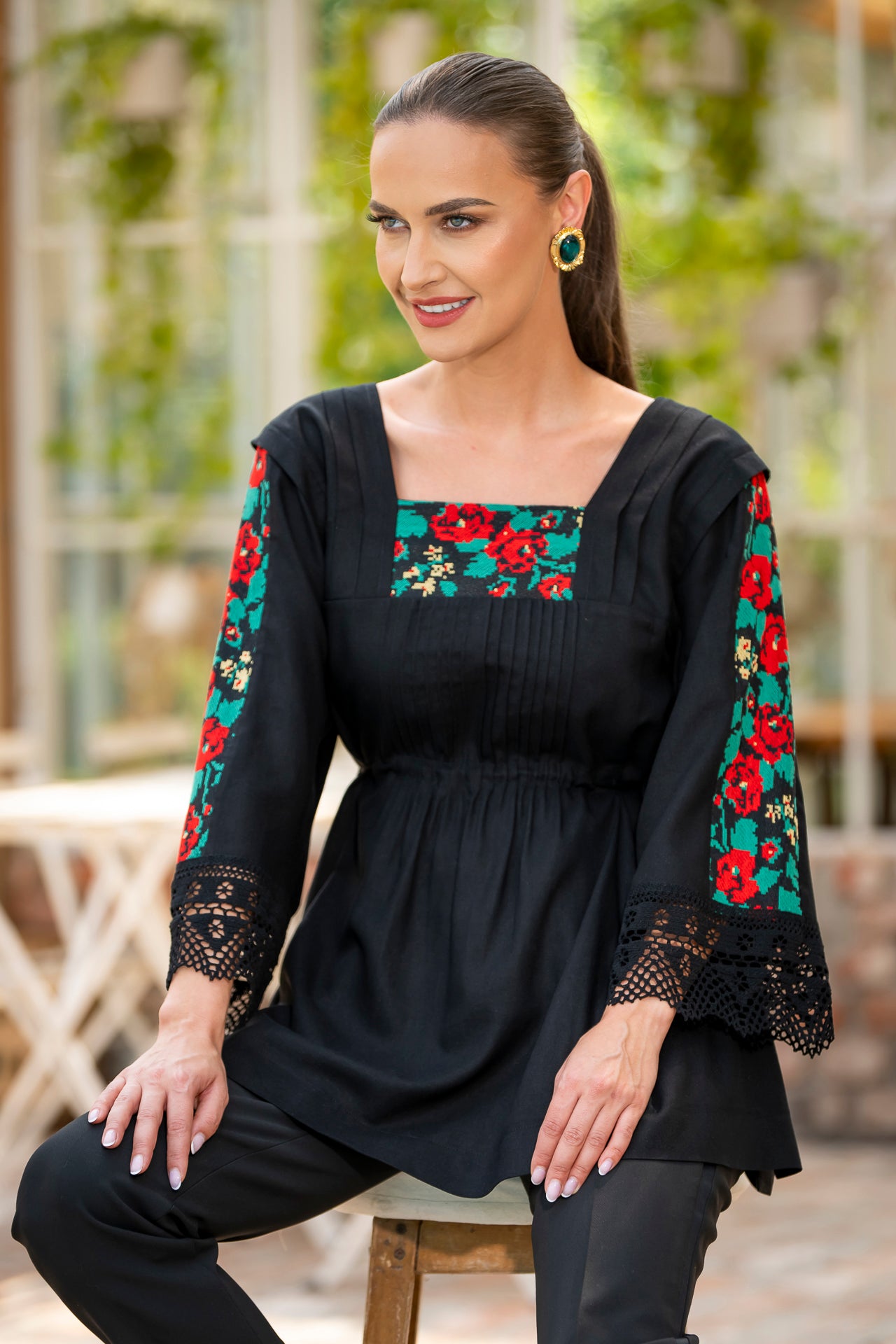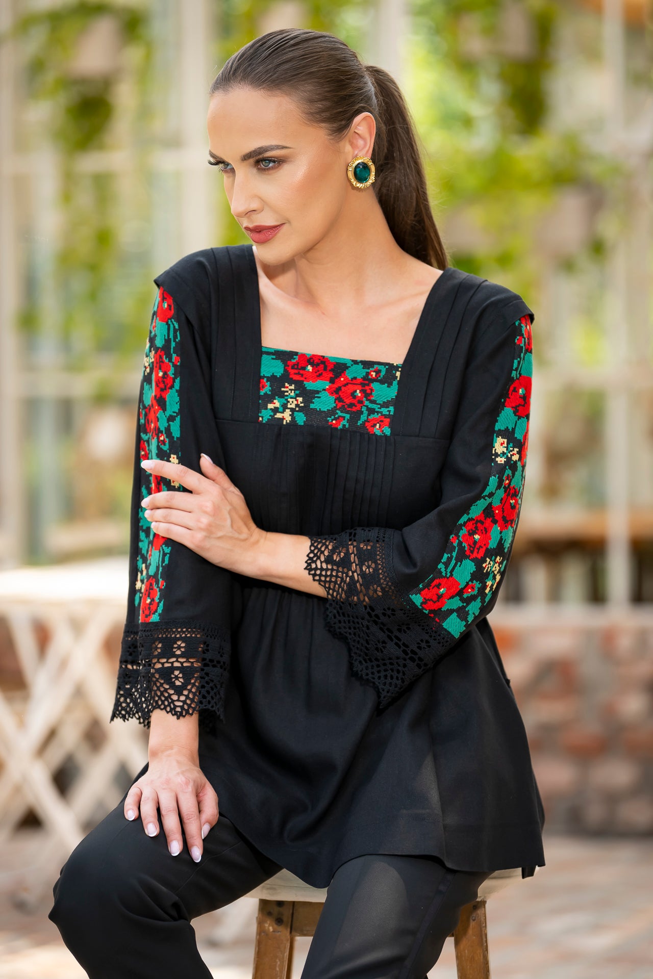 Bluza este confecționată din in negru și înnobilata cu dantelă tradițională și jacquard țesut.