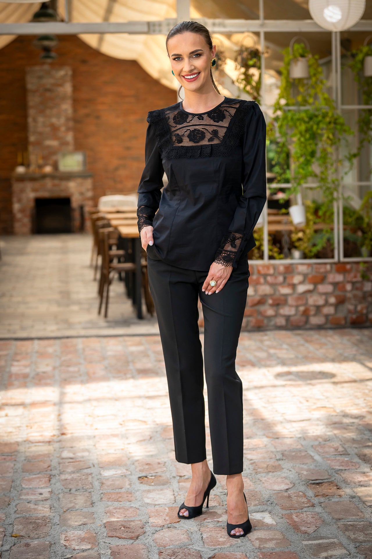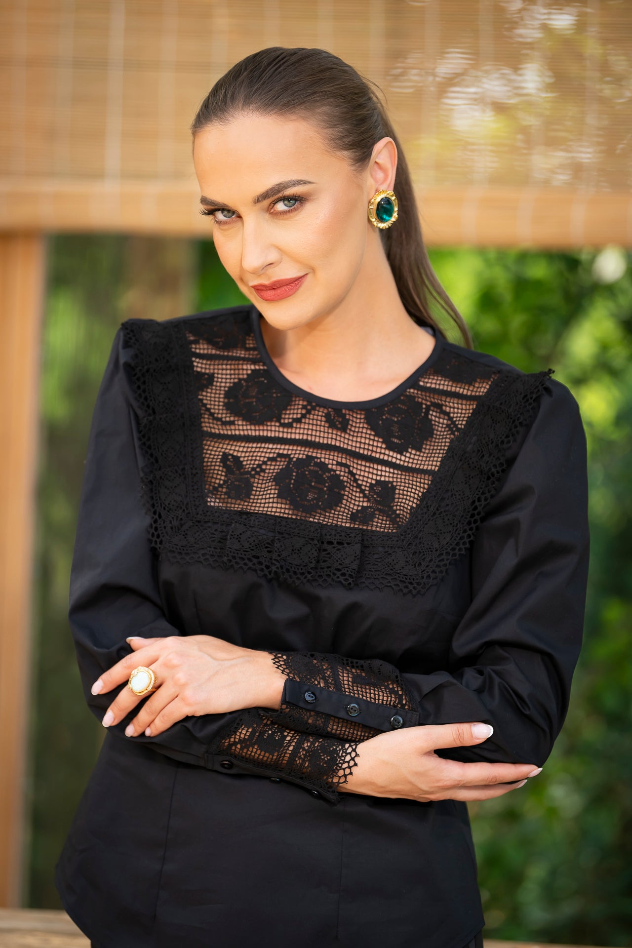 Cămașa romantică neagră  cu dantelă traditională are o croială ușor cambrată, cu plătcuță și manșete late din dantelă tradițională de bumbac.