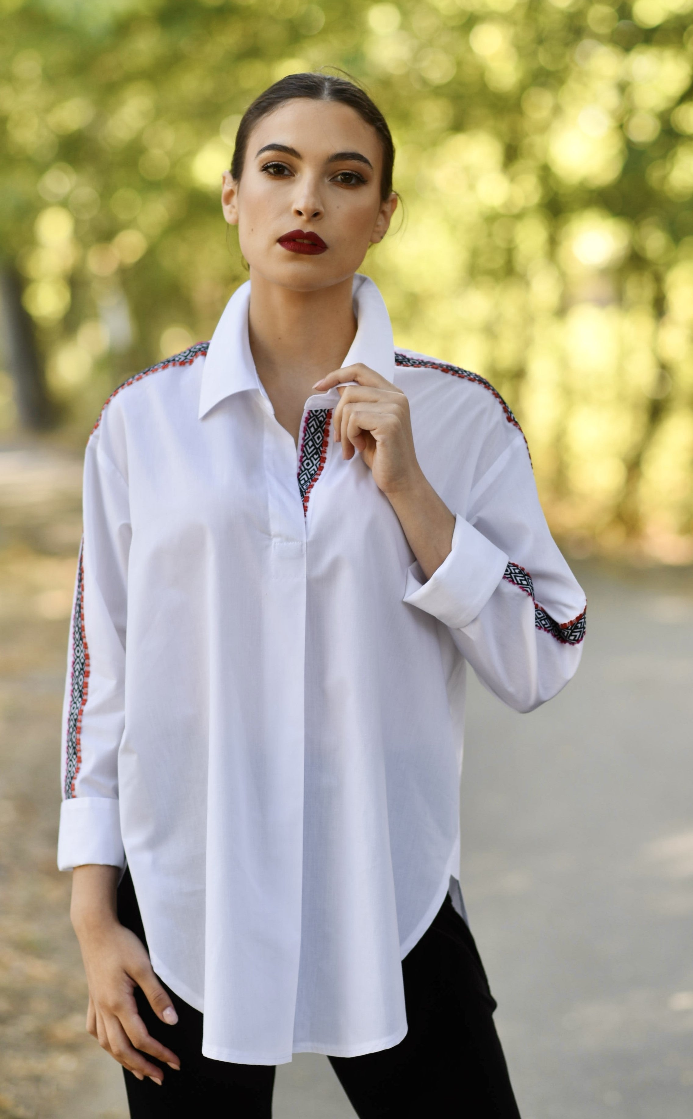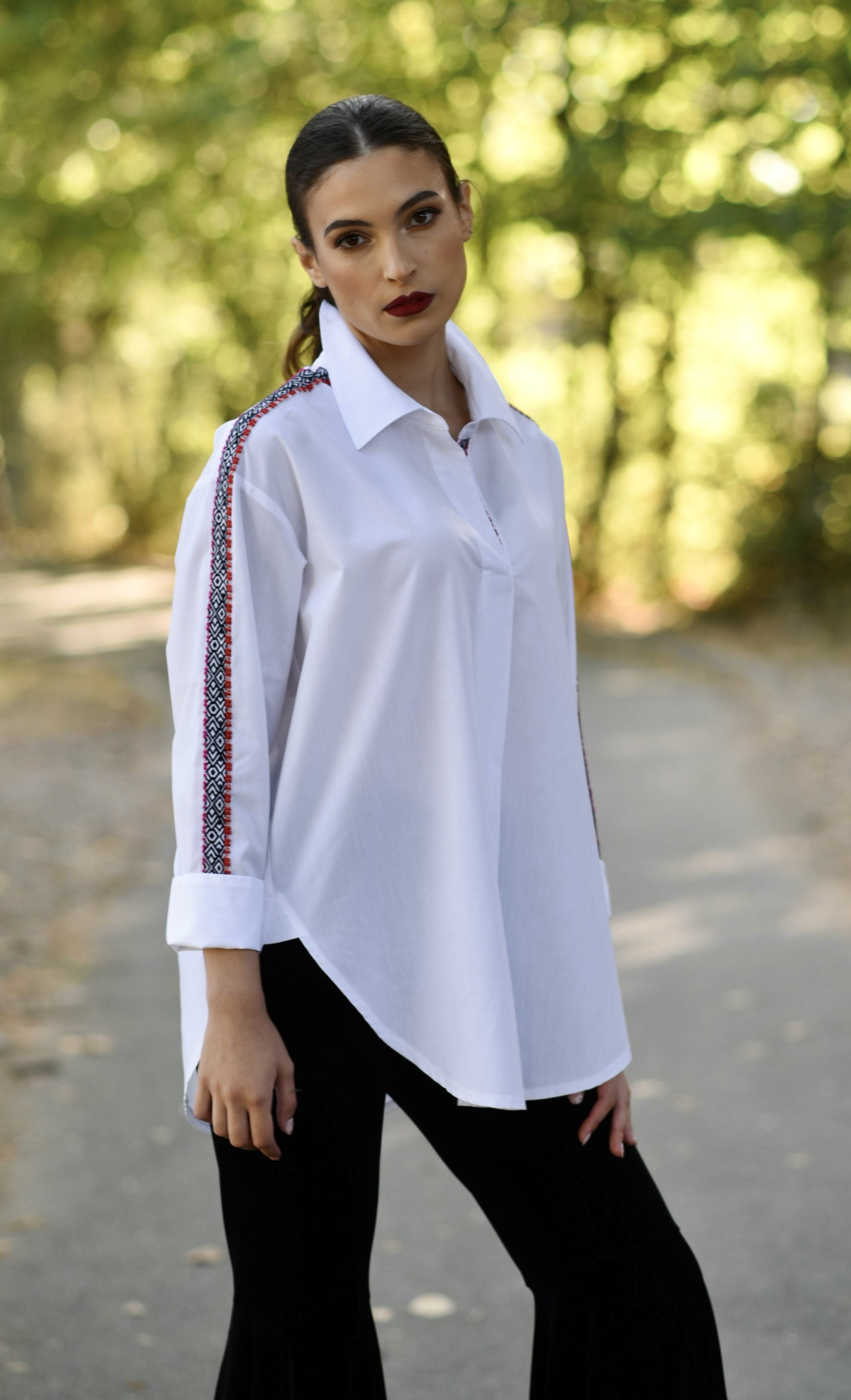 Cămașa are un croi modern, lejer și este confecționată din bumbac alb cu jacquard etnic țesut.