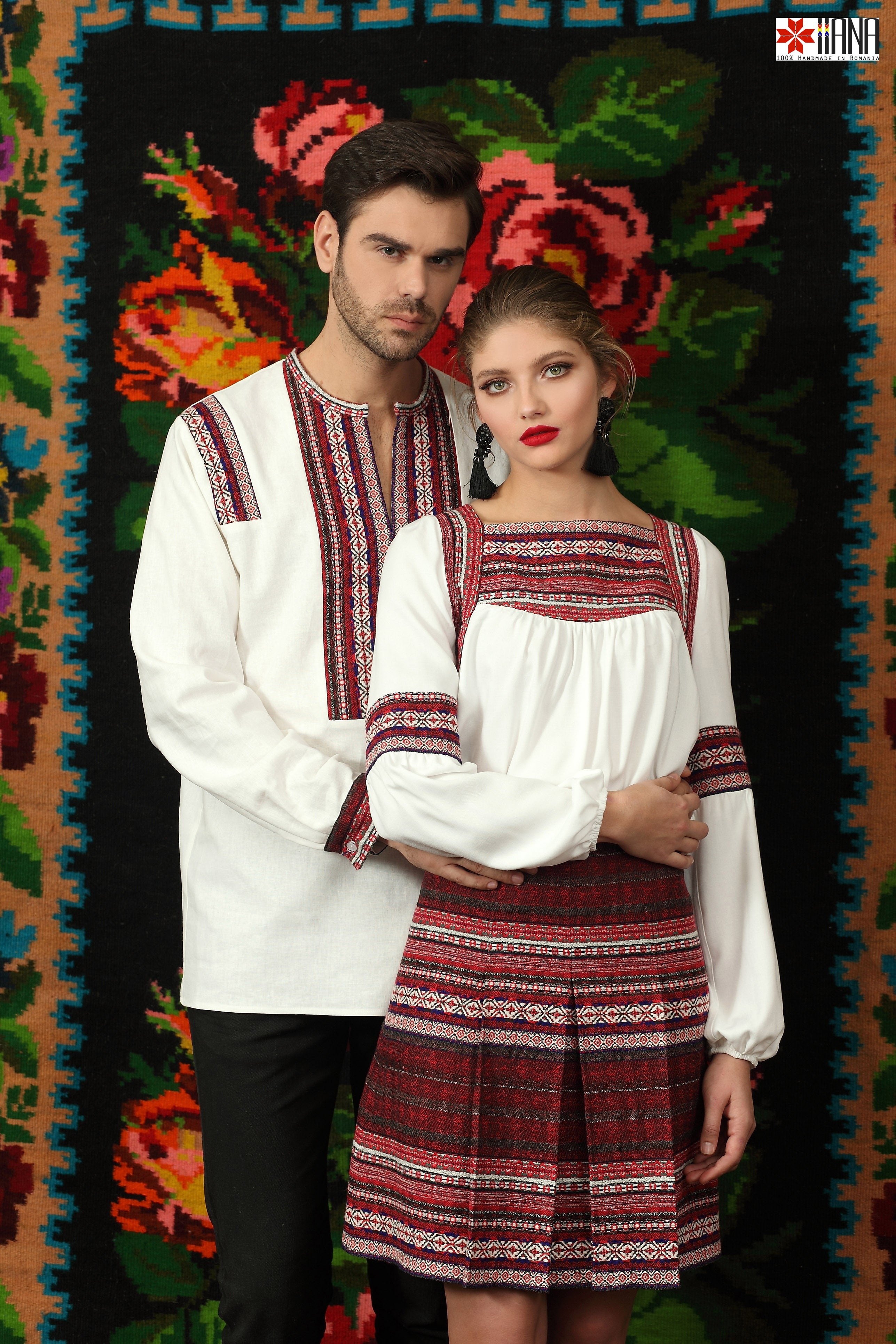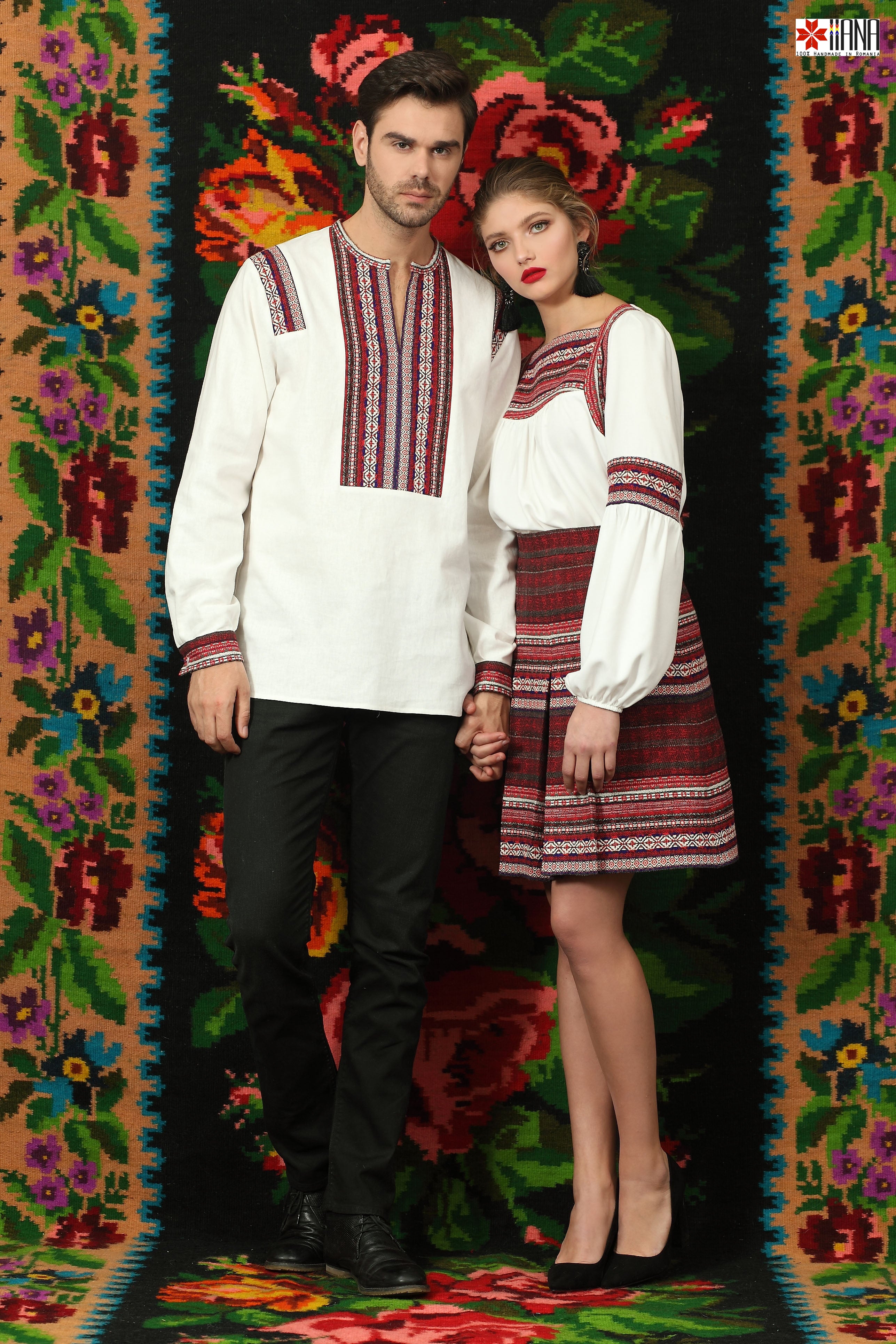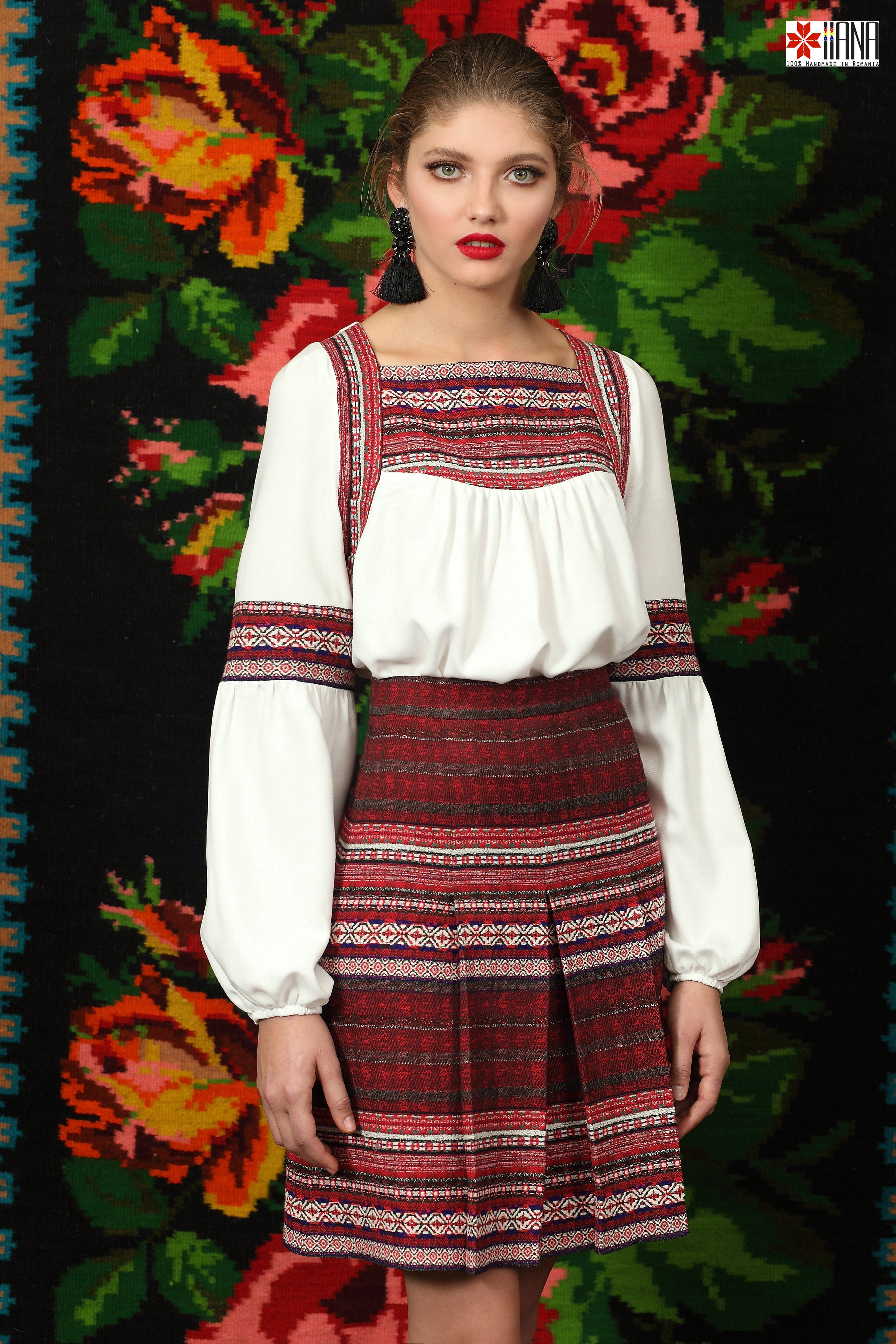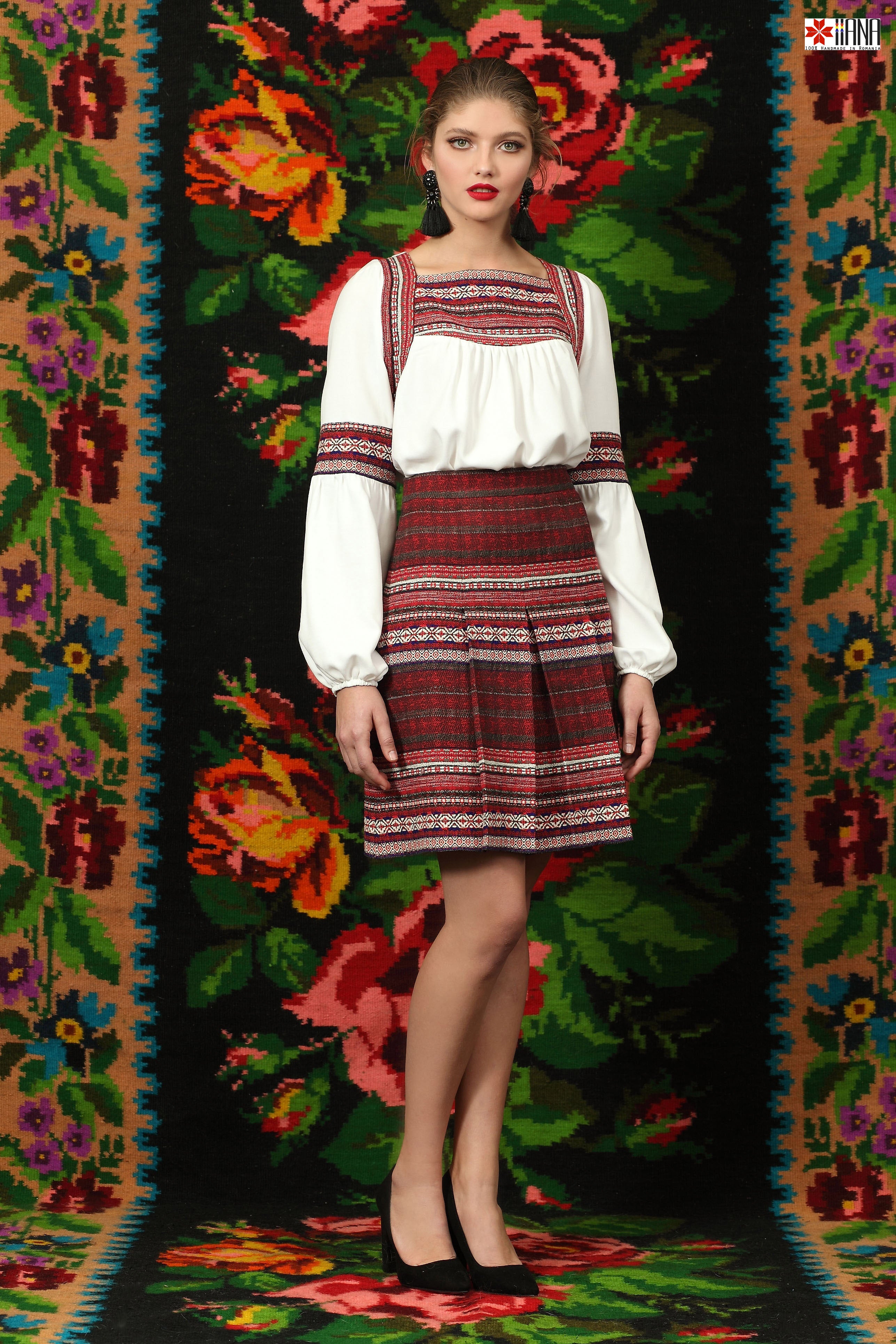 cu motive tradiționale, are croială evazată, iar pe față are pliuri cusute.