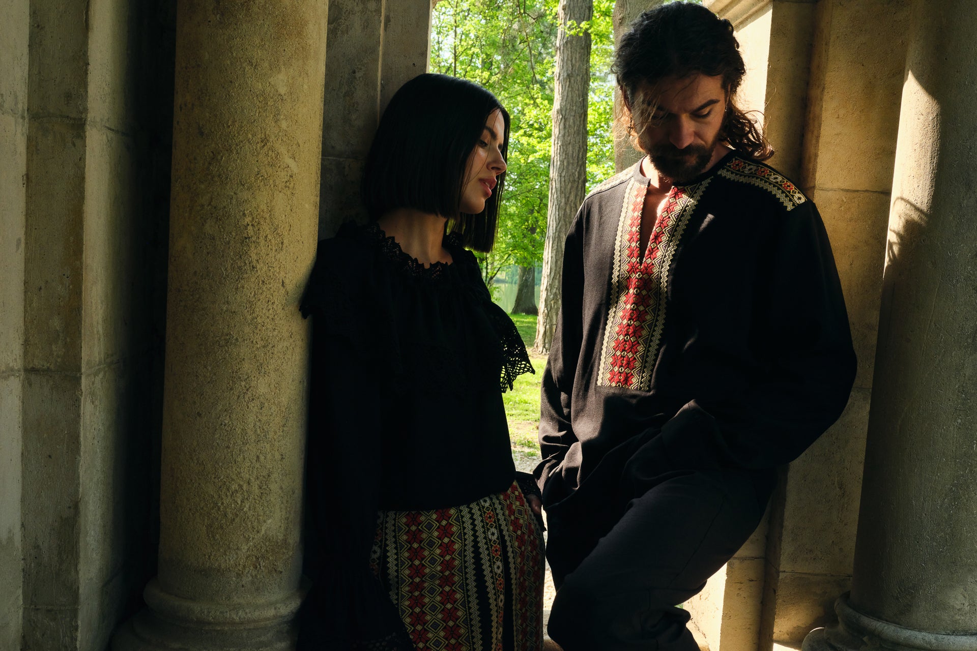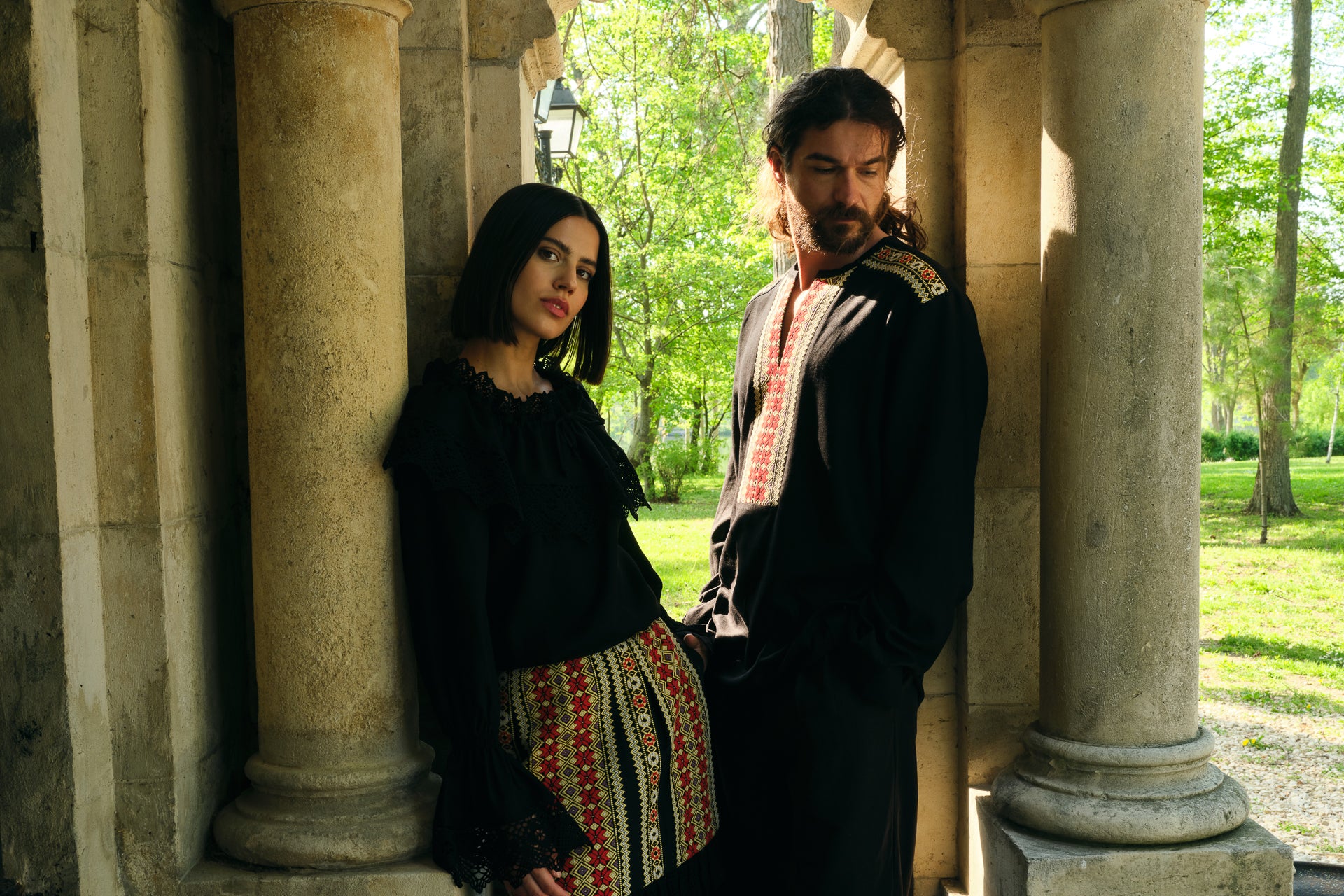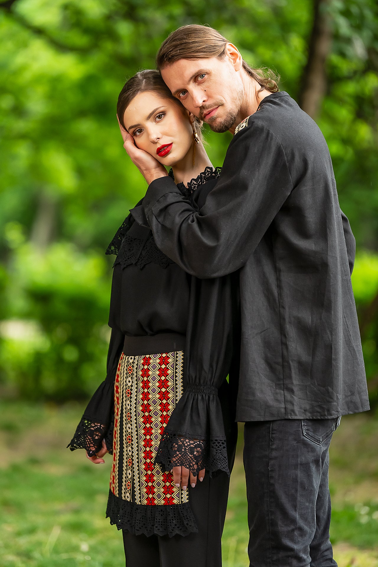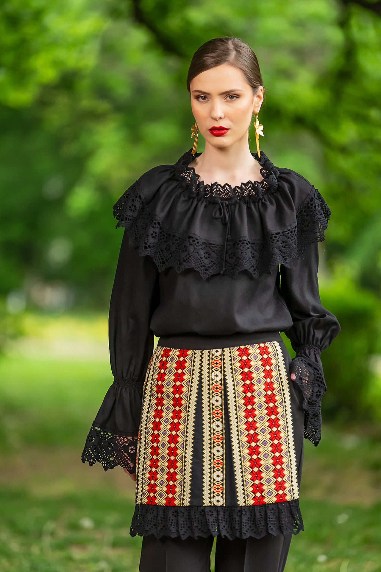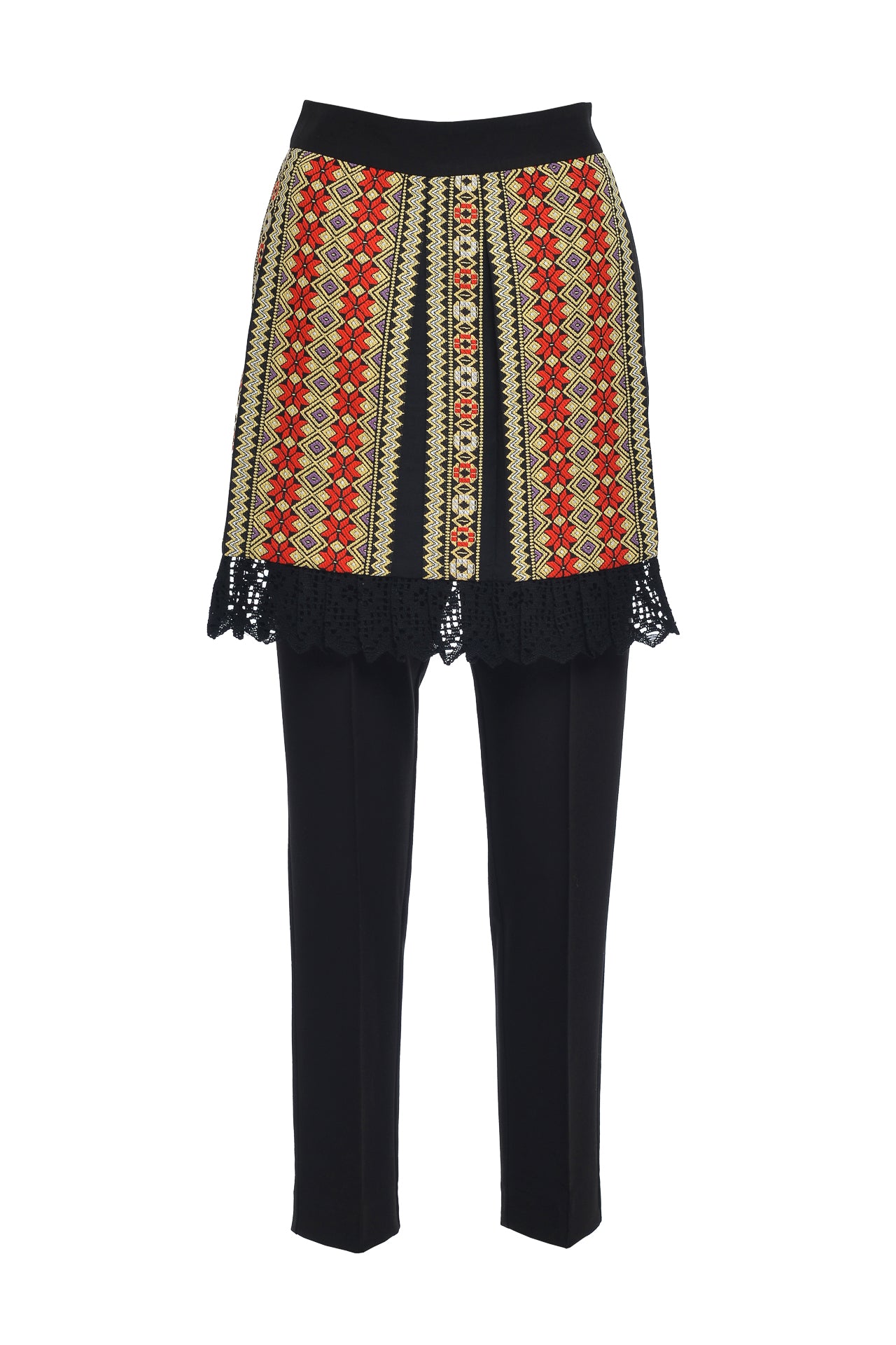 Pantaloni negri cu fotă sunt confecționați din stofă de viscoză cu elastan de densitate medie, cu fotă din jacquard etnic țesut în contextură și dantelă tradițională de bumbac.