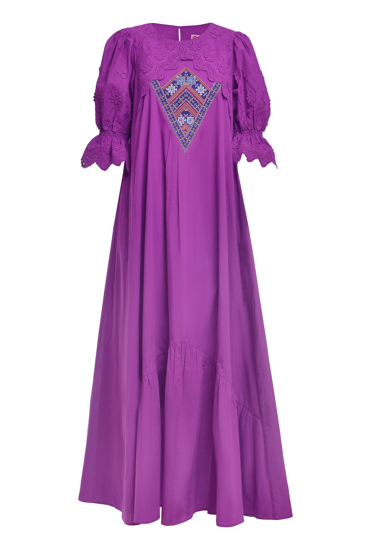 Rochia lungă violet din batist cu jacquard etnic și broderie tridimensională