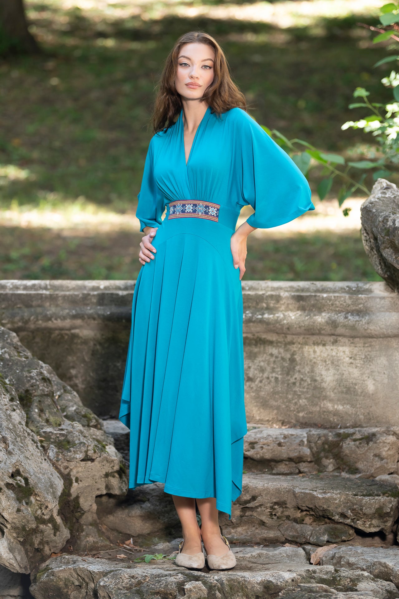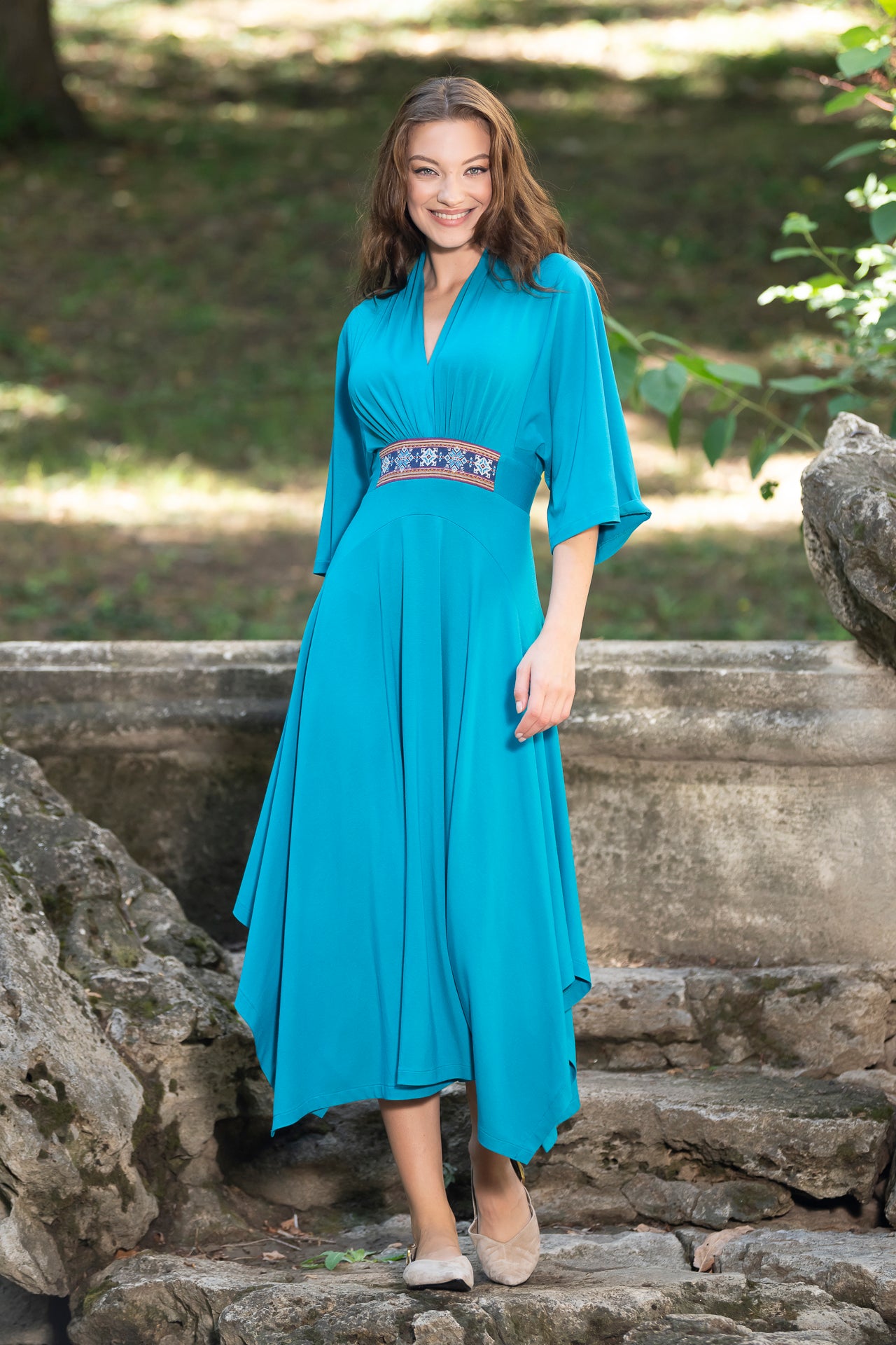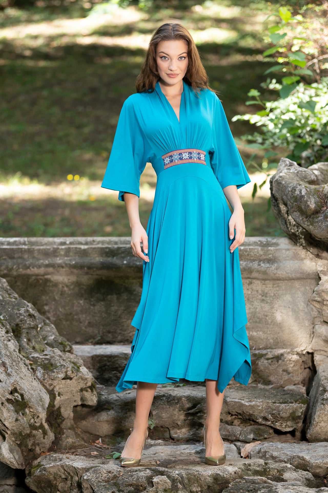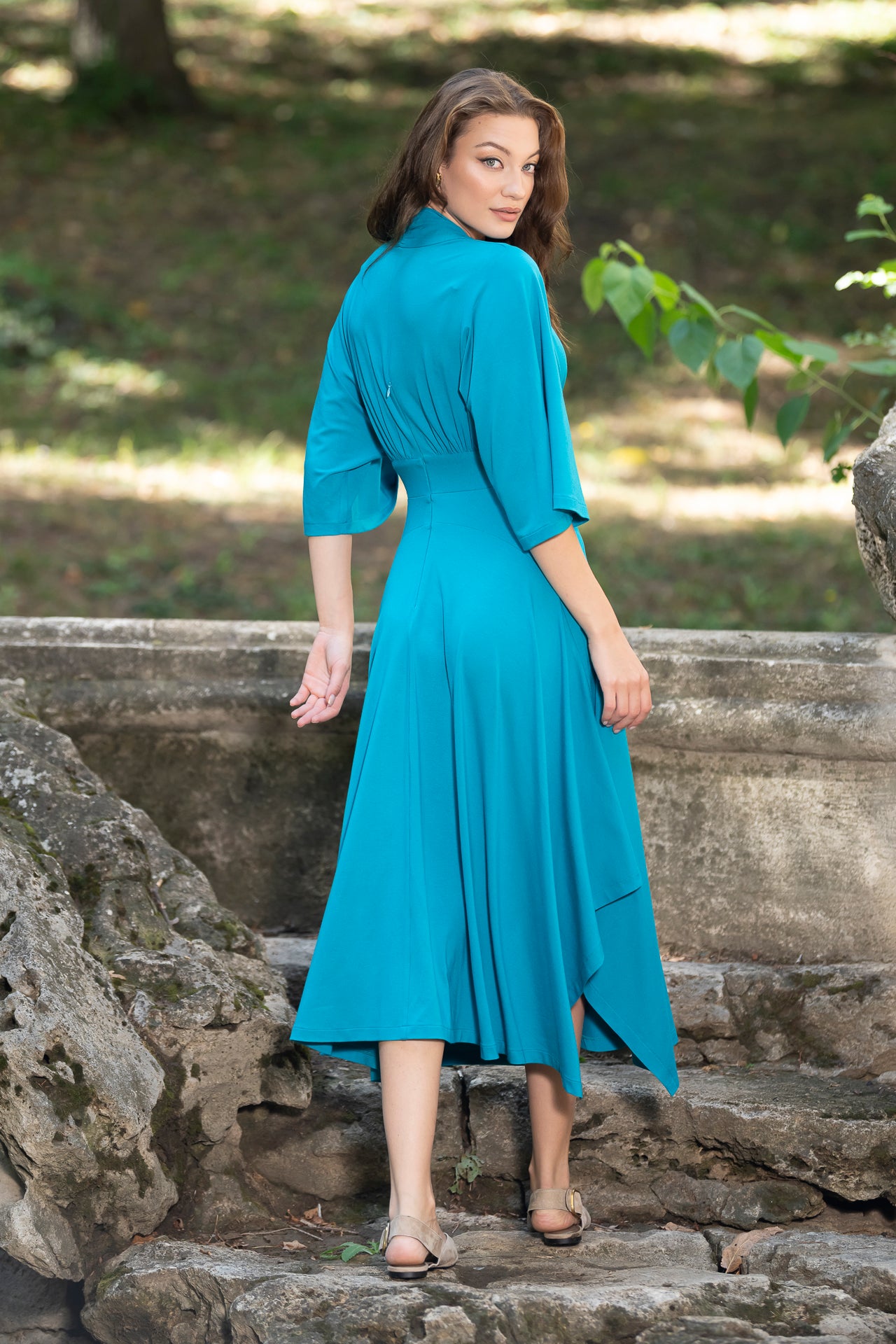 Rochia turcoaz are un croi versatil și sofisticat, cu talia marcată de jacquardul  țesut și fusta în colțuri cu corseletă.