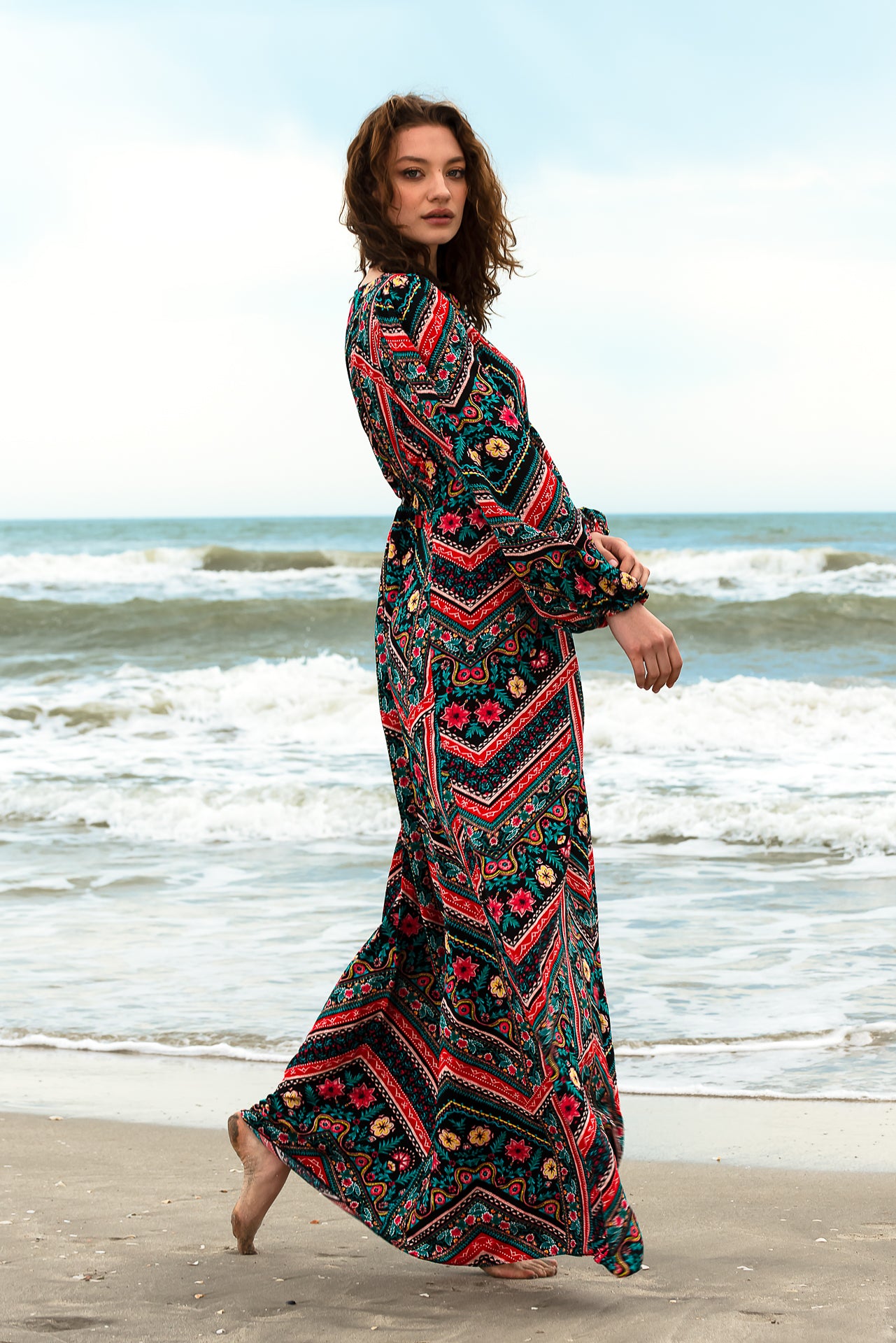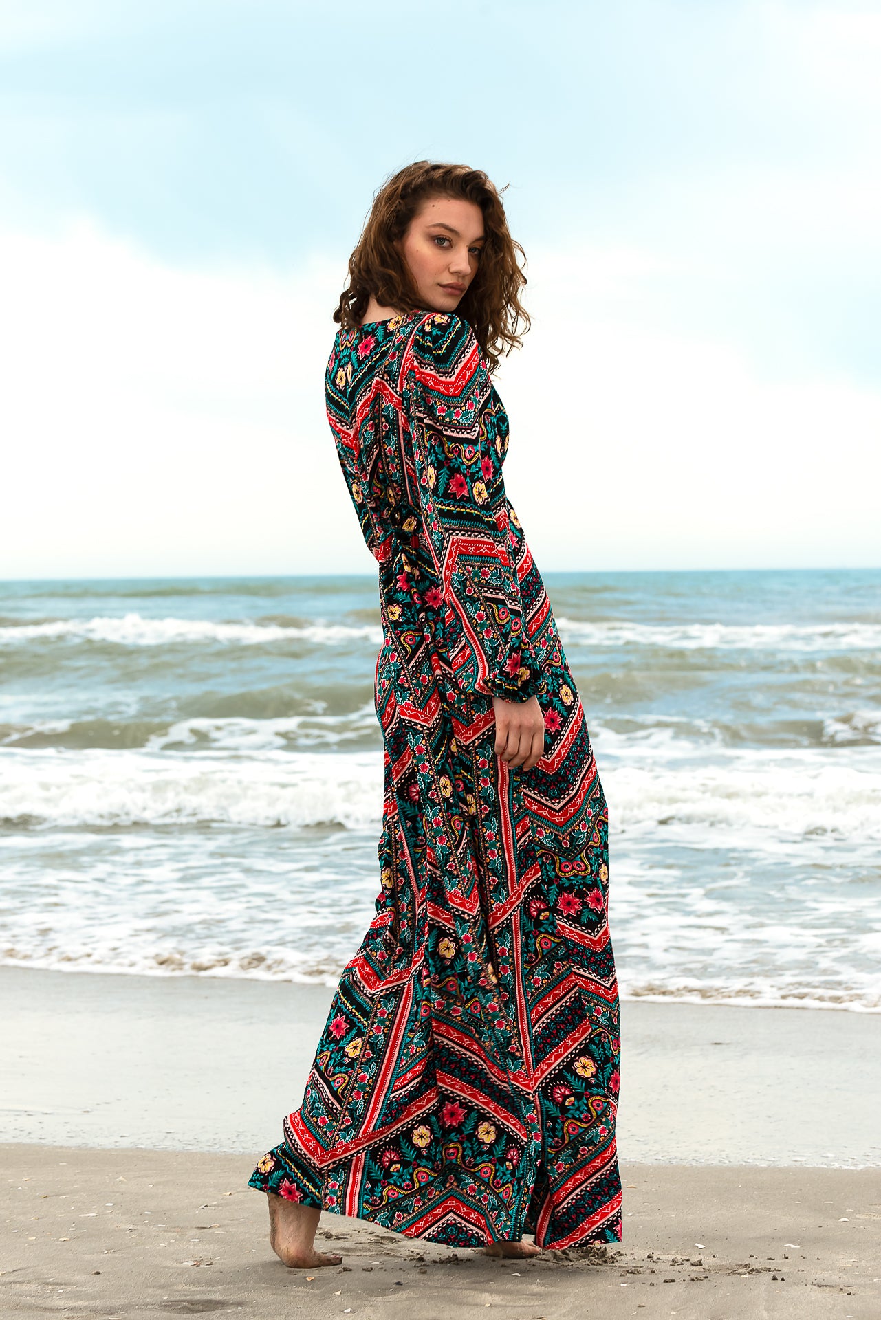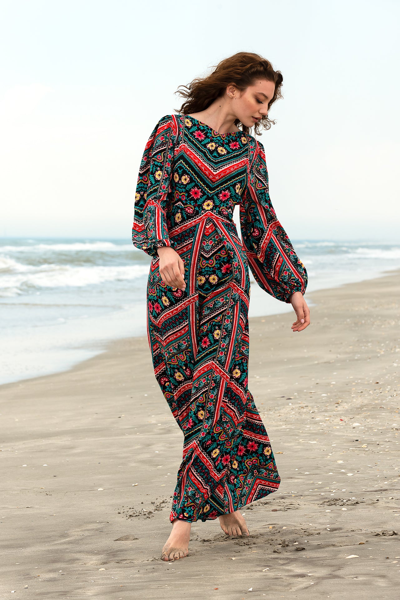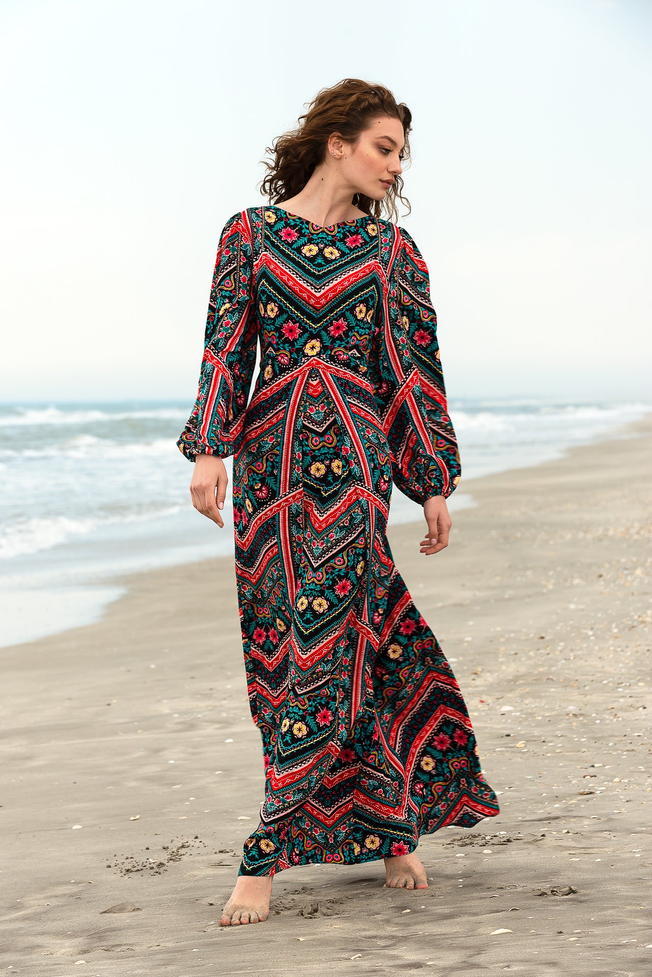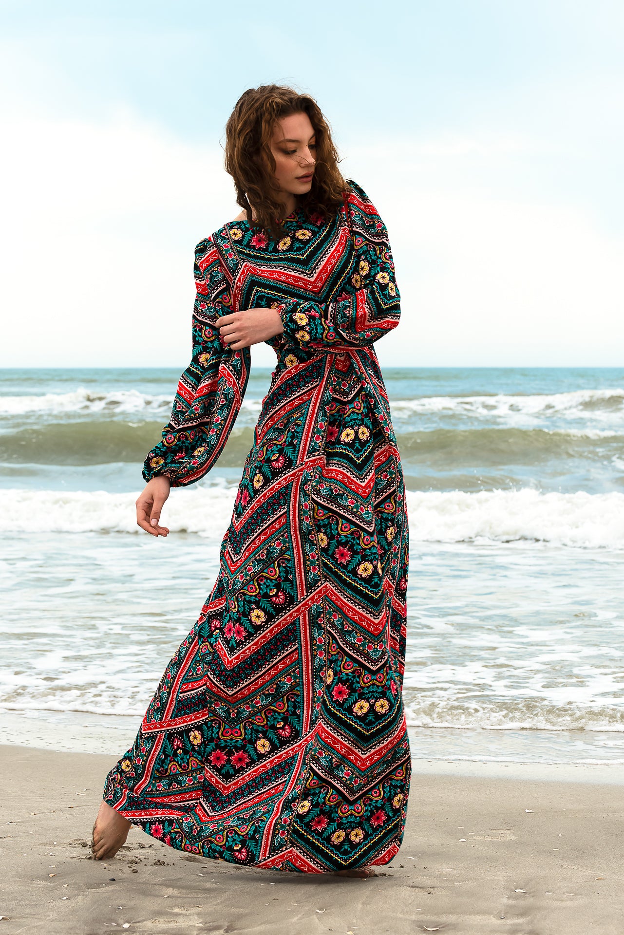 imprimată digital cu motive geometrice și florale. Rochia este căptușită și