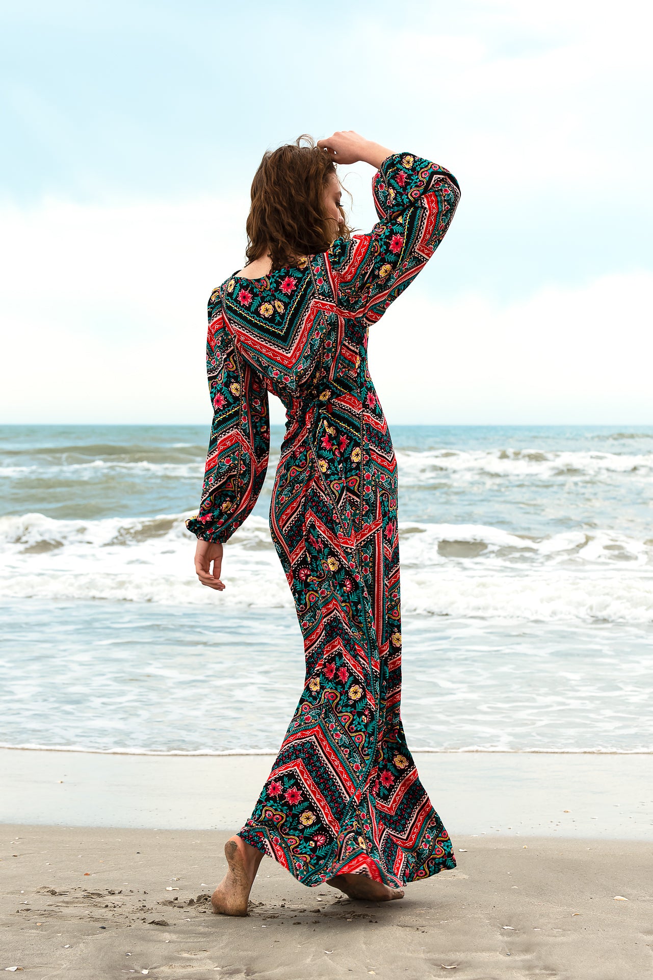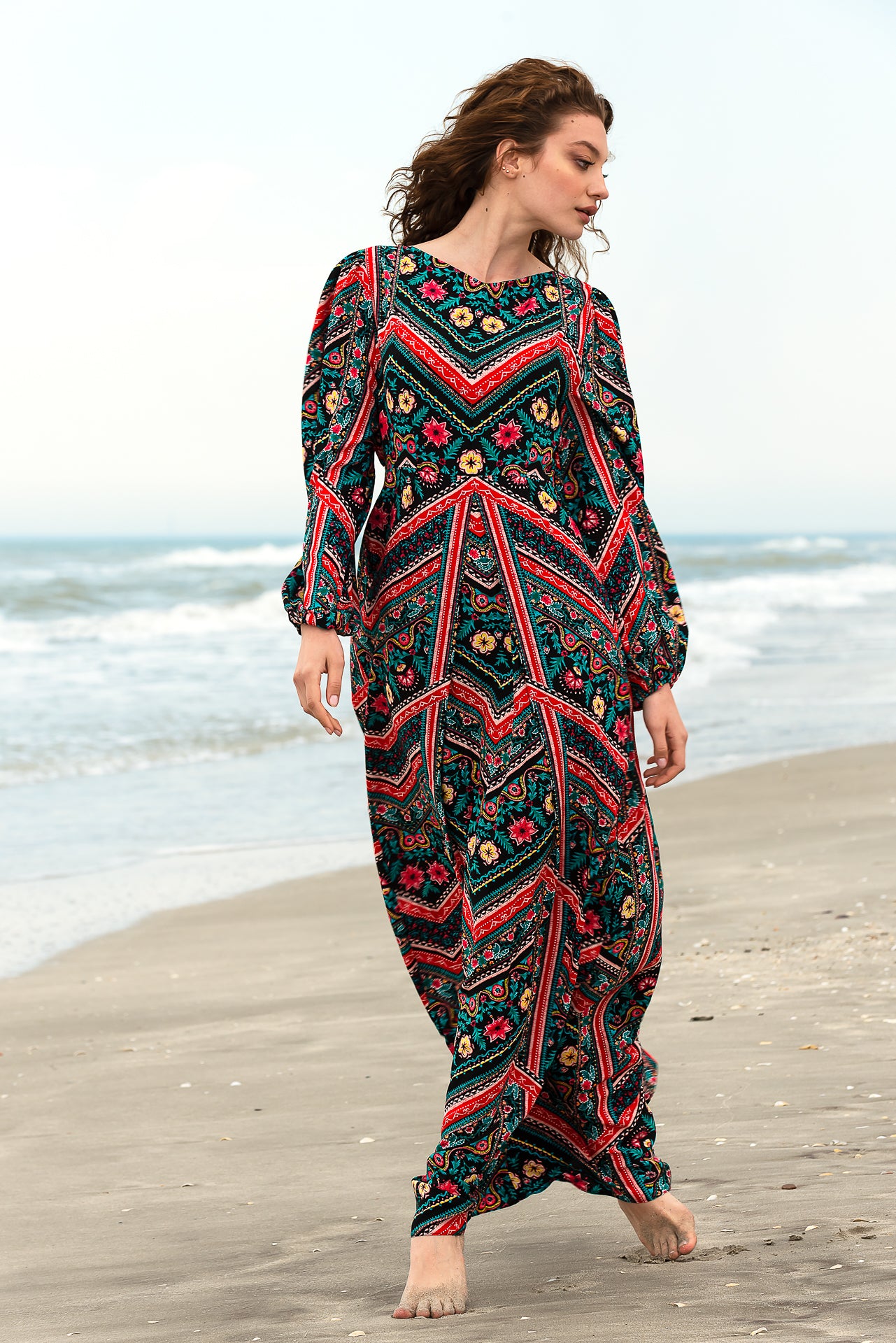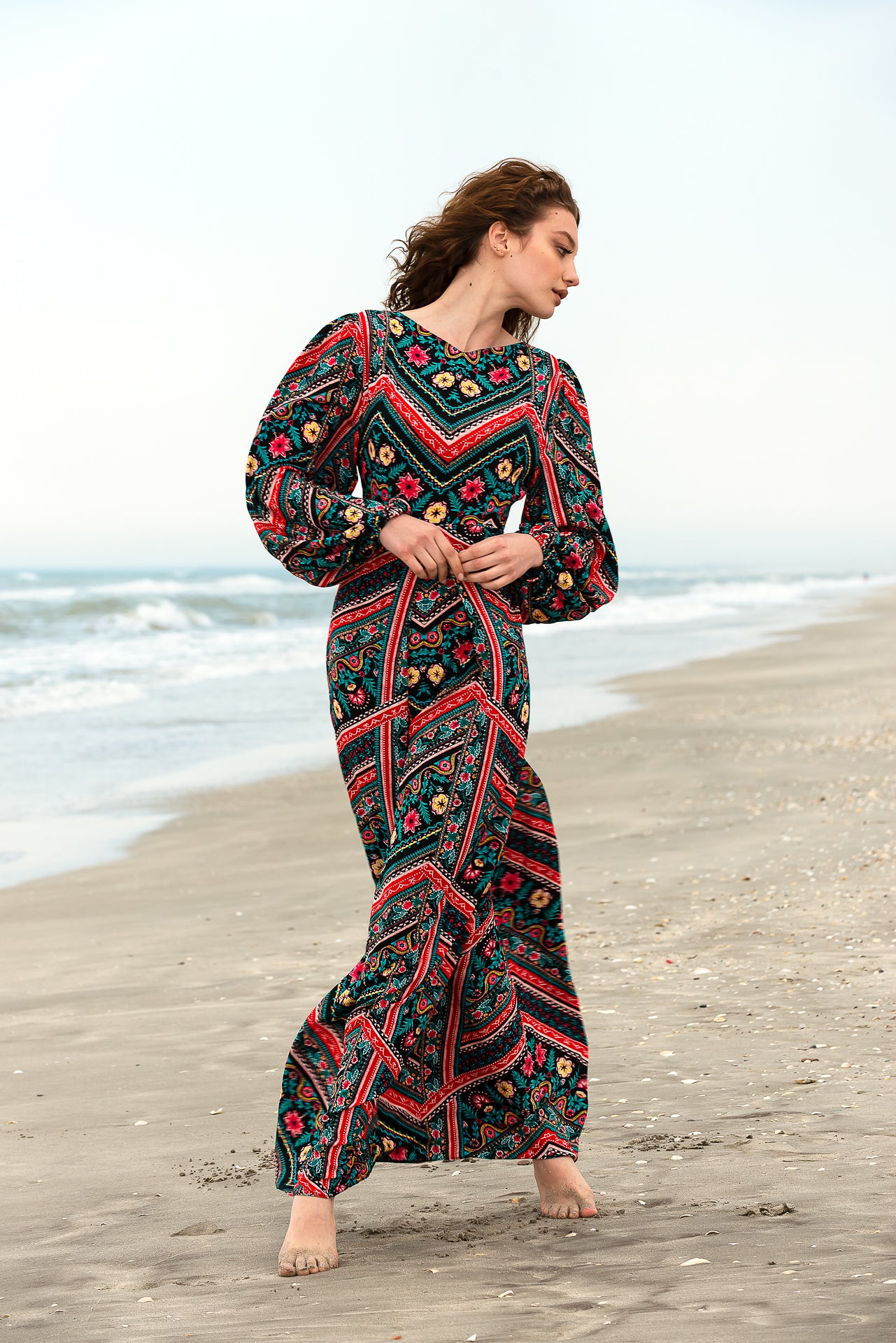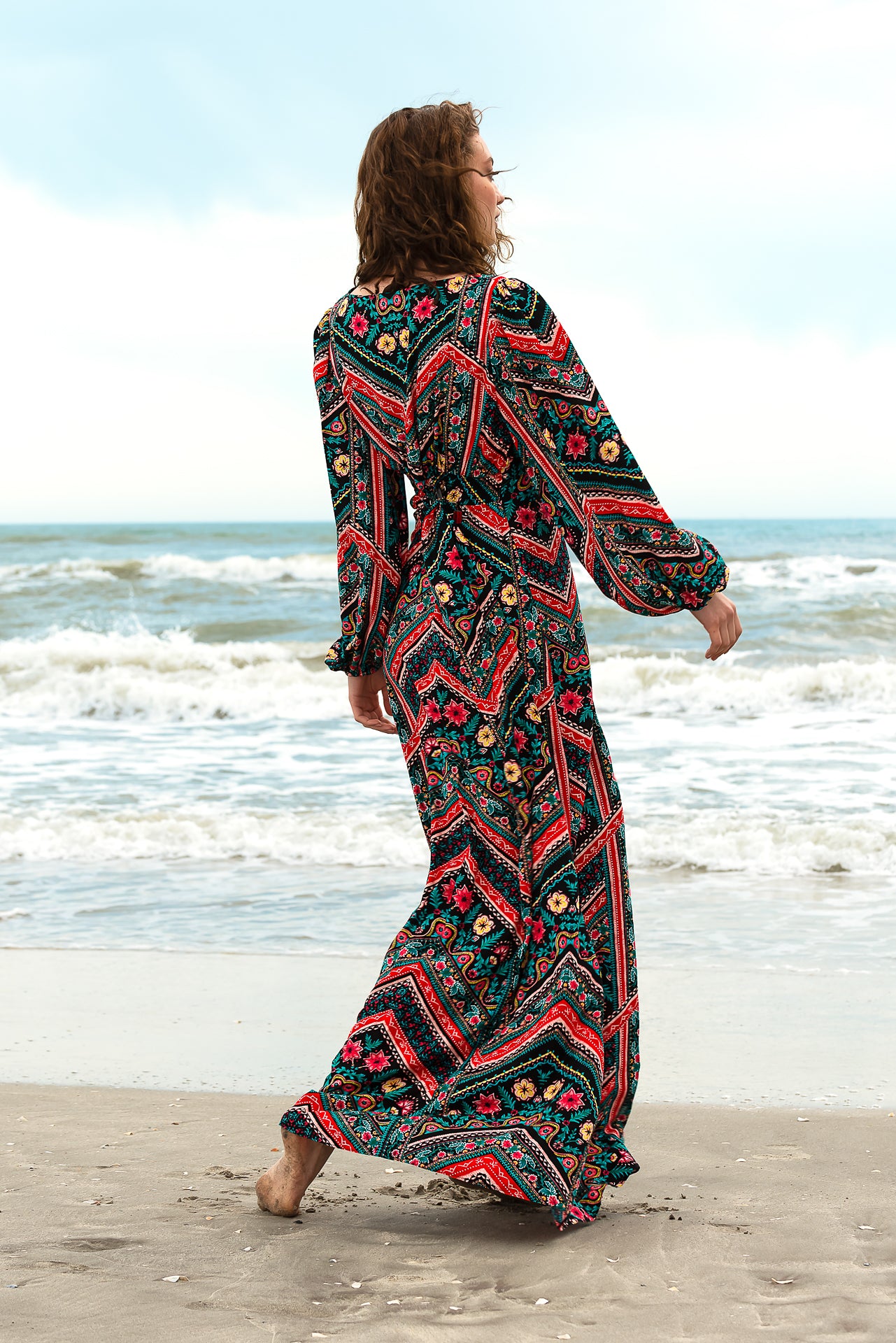 imprimată digital cu motive geometrice și florale. Rochia este căptușită și