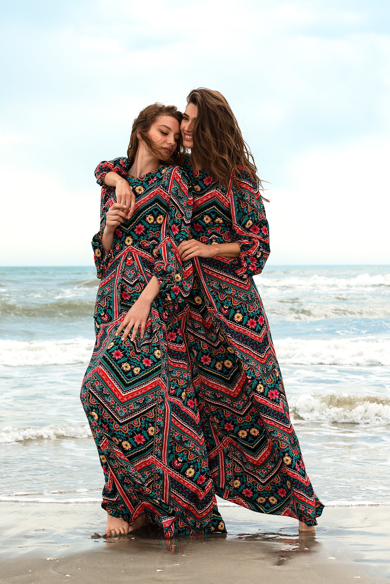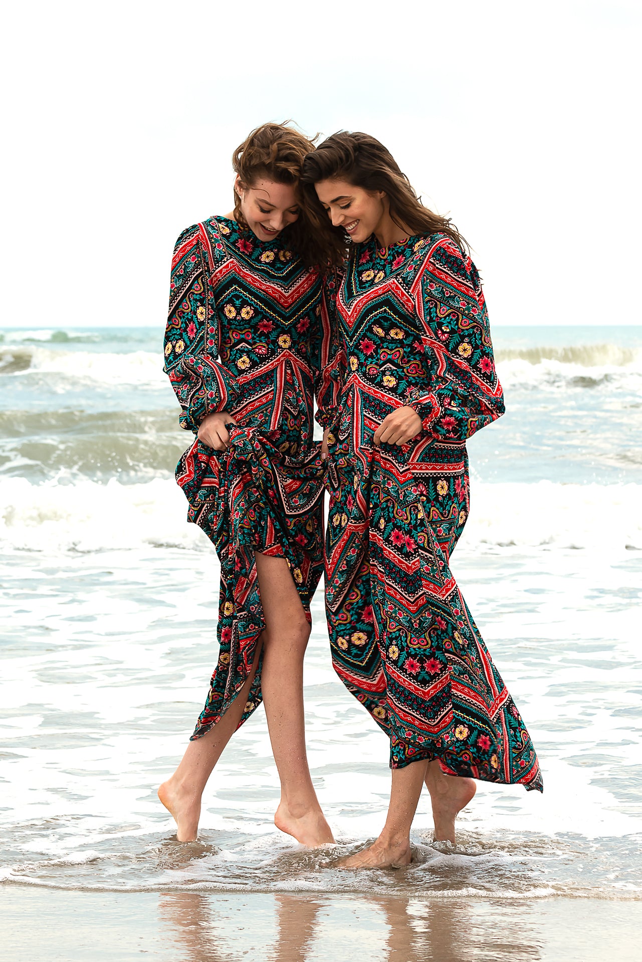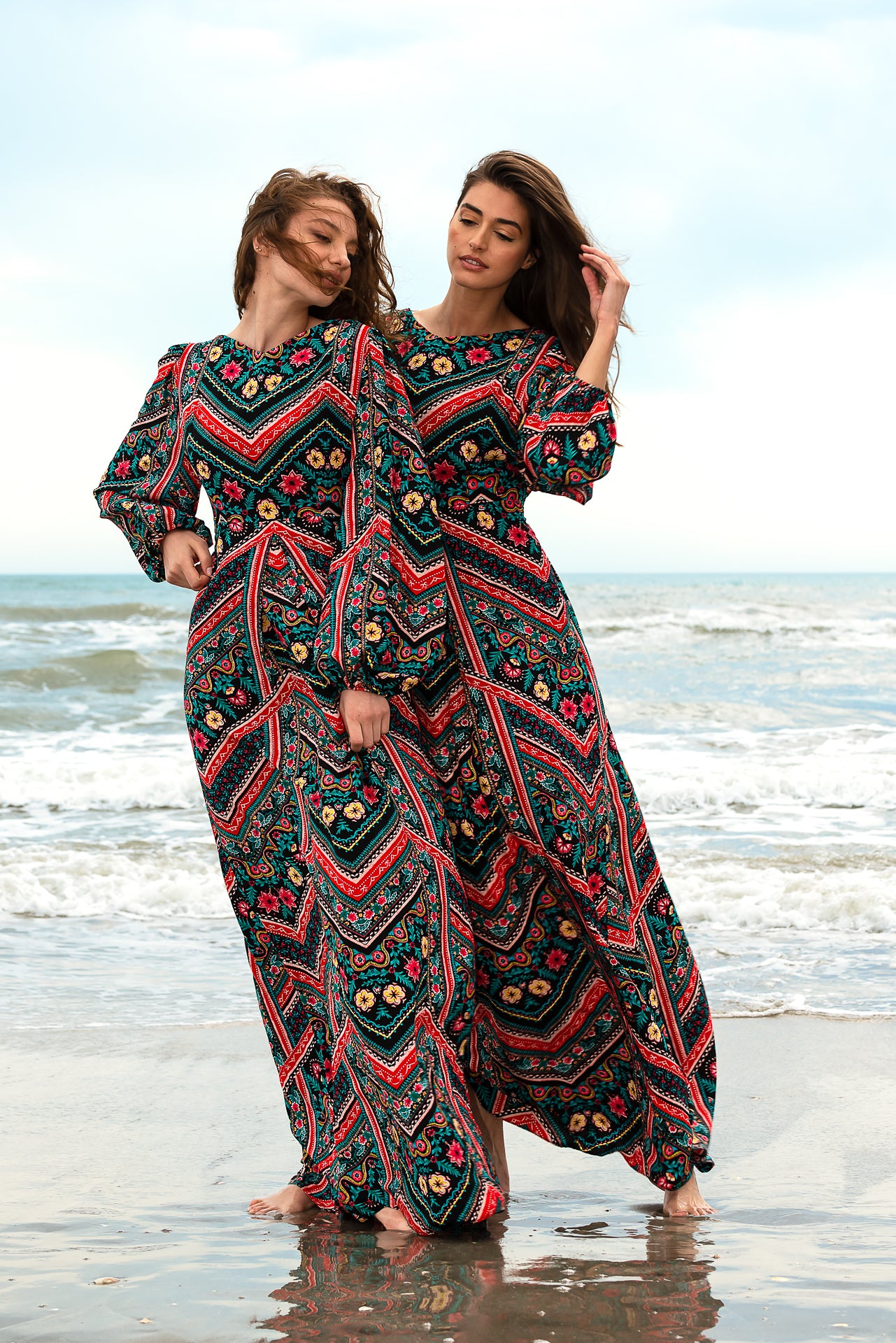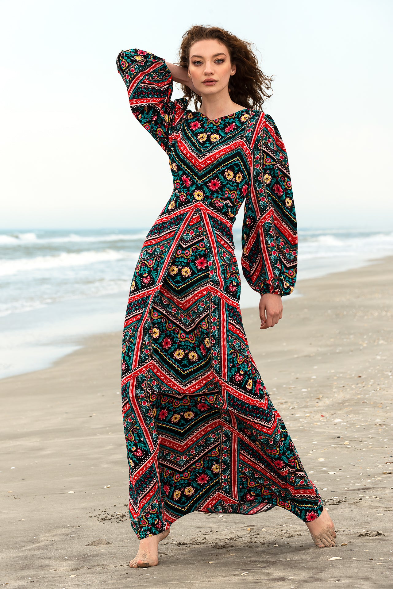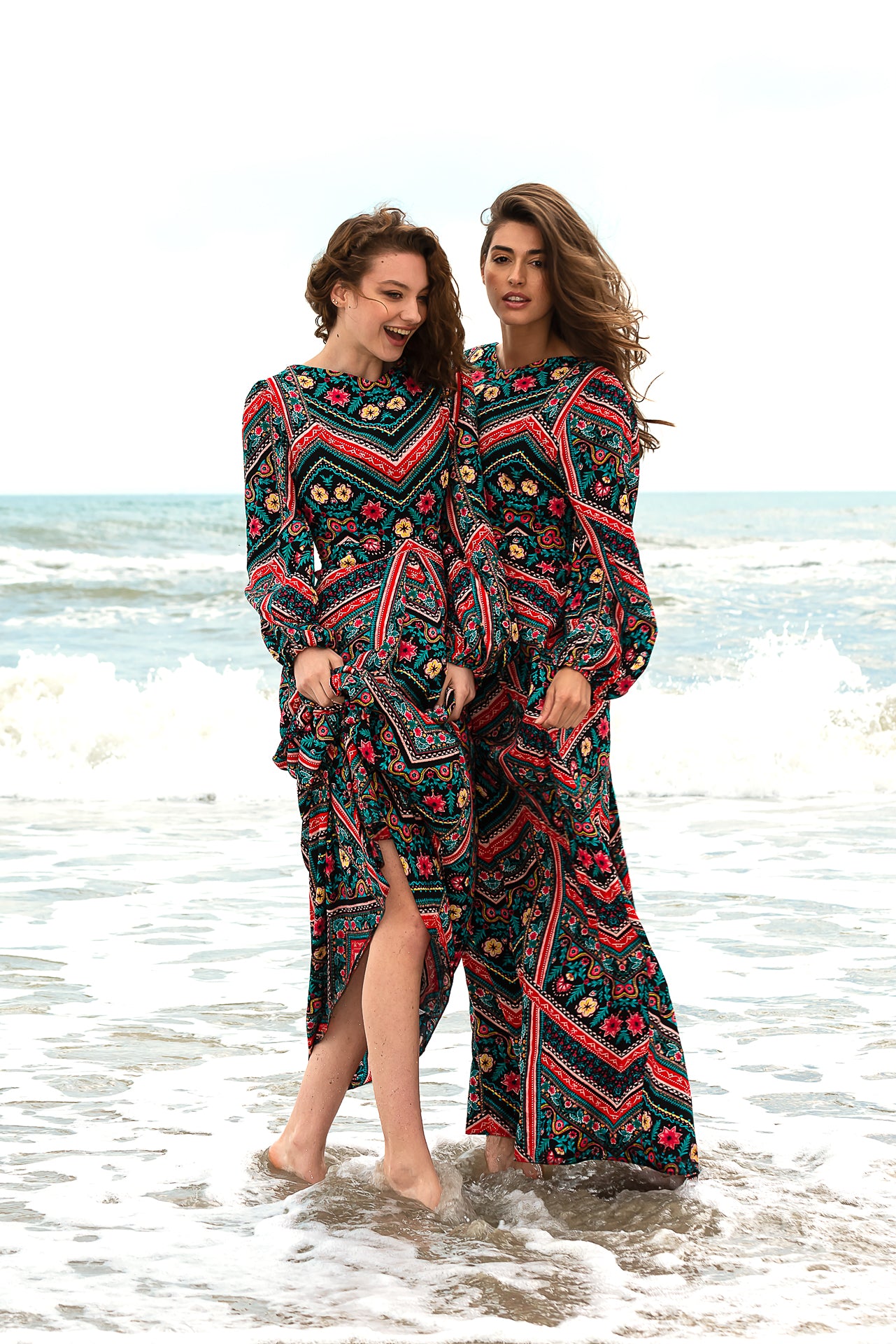 imprimată digital cu motive geometrice și florale. Rochia este căptușită și