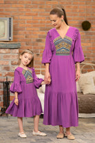 Rochița lila pentru fetițe este confecționată din pânză lila din bumbac și jacquard etnic țesut cu motive tradiționale.