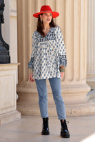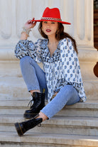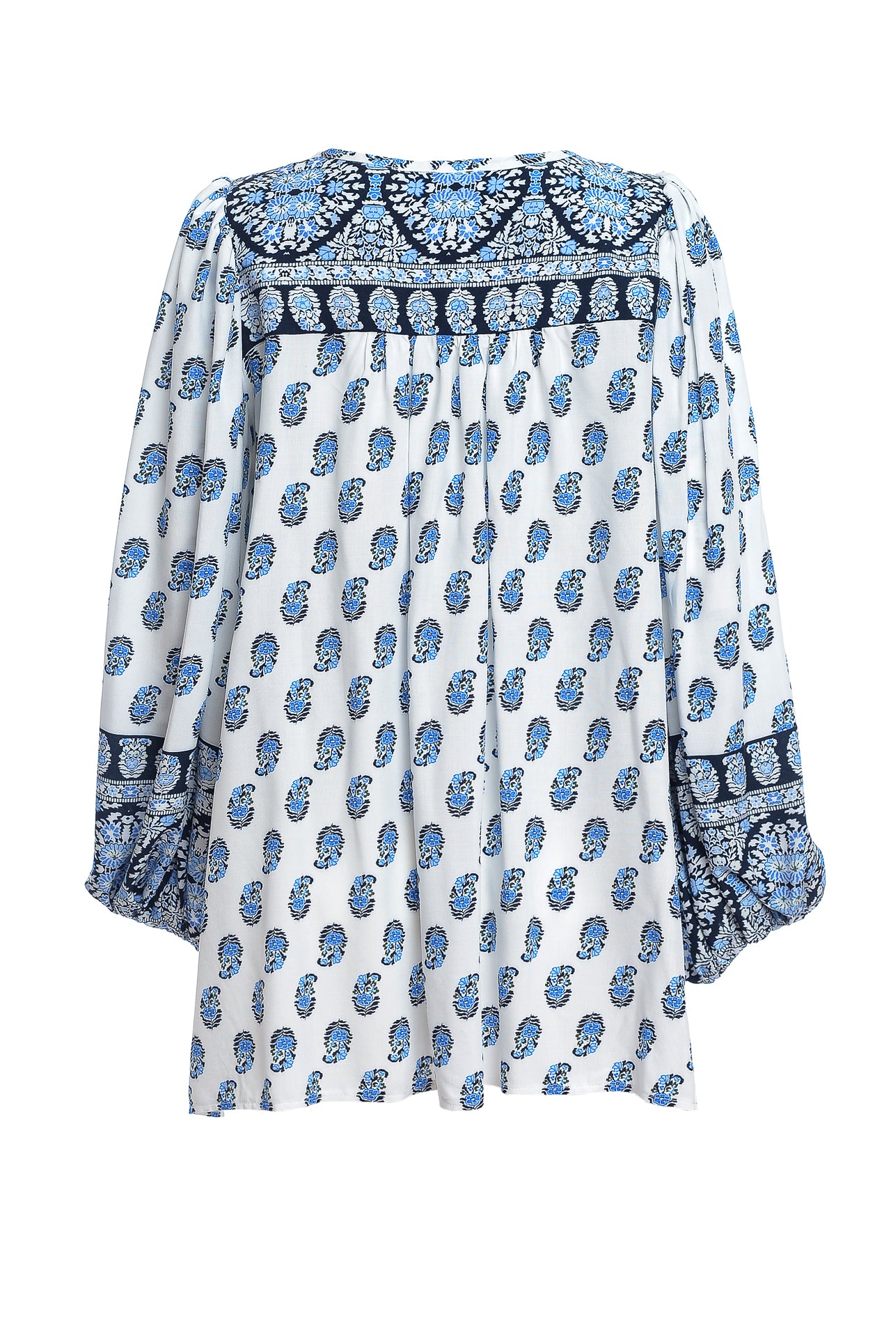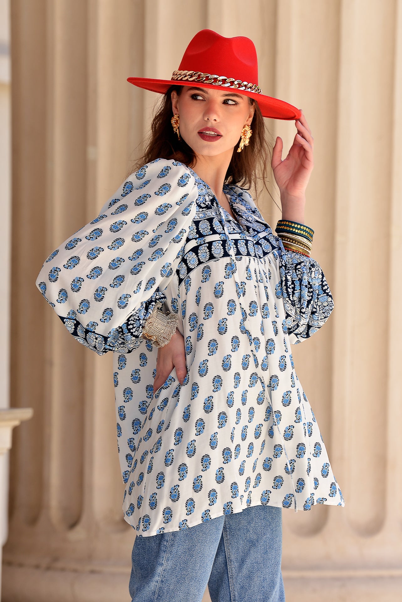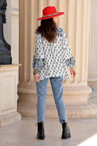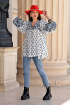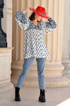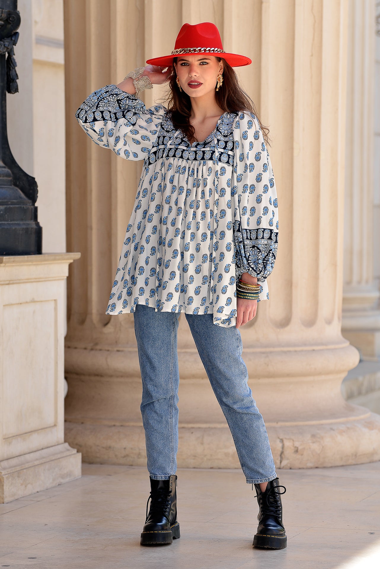 Bluza Boho Aria este confecționată din vâscoză imprimată digital cu motive florale și geometrice. Are un croi în stilul boho-chic, cu volumetrie amplă. Prezintă mâneci bufante, care conferă designului un look fresh, tineresc.